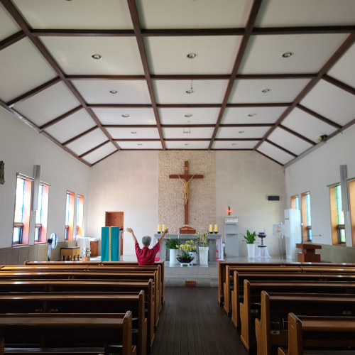 성전앞 감실앞에 앉아 양팔 들어올려 묵주의 신비 한단을 주님께 올려드린다.