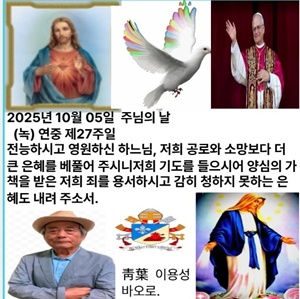 2025년 10월 5일 주일 (녹) 연중 제27주일 오늘은 연중 제27주일입니다. 하느님 아버지께서 겨자씨 한 알만 한 믿음이라도 보시고, 우리에게 겸손한 마음을 주시어, 온 힘을 다하여 아버지의 나라를 전하게 해 주시기를 청합시다. 우리가 쓸모없는 종임을 깨닫고 아버지의 위대한 사랑을 세상에 드러냅시다.