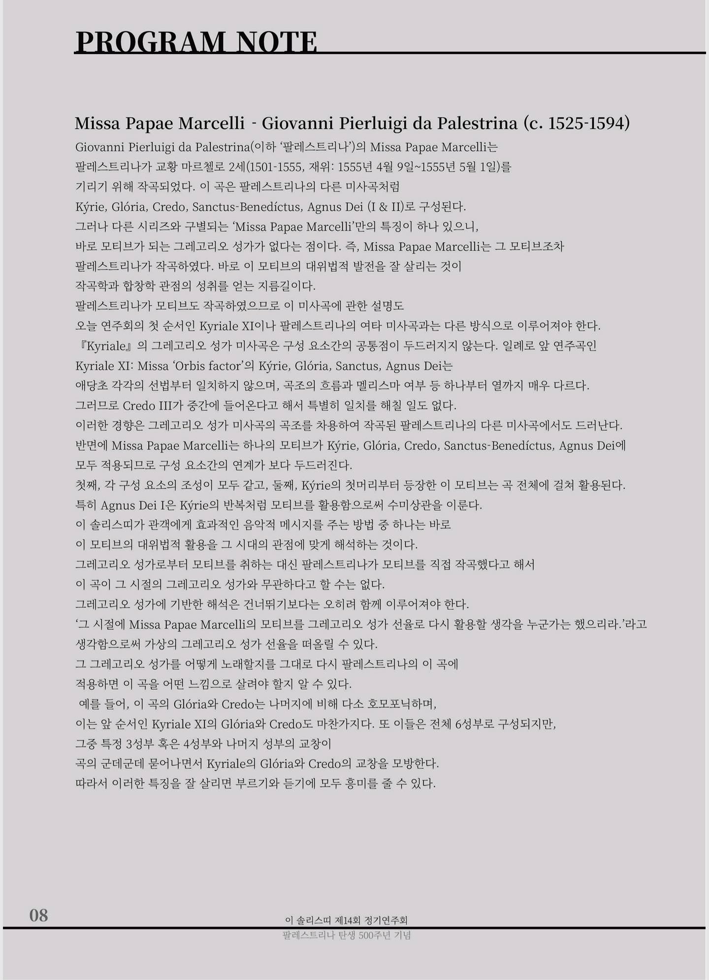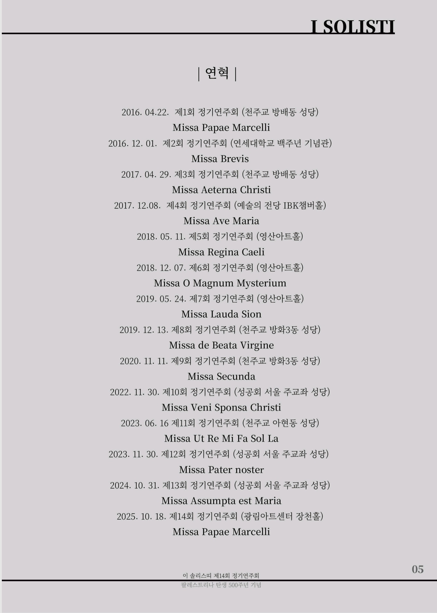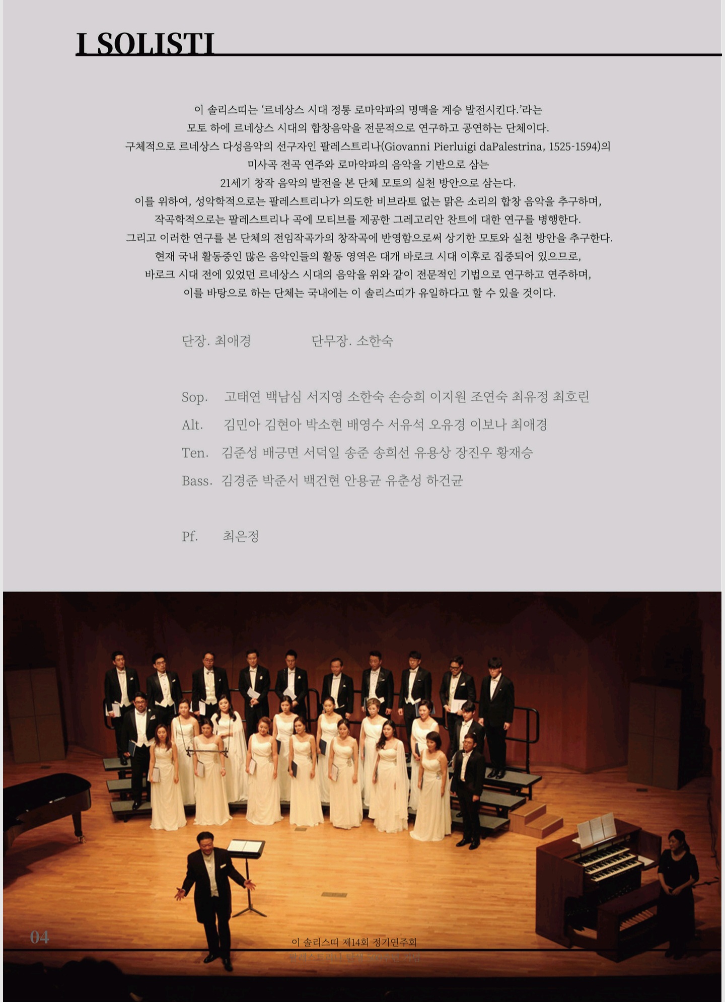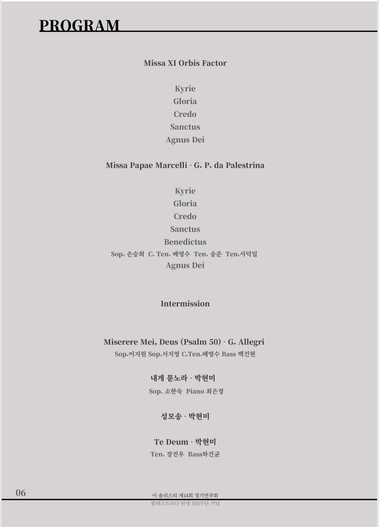 이 솔리스띠 제14회 정기연주회 "Missa Papae Marcelli" 프로그램 |
