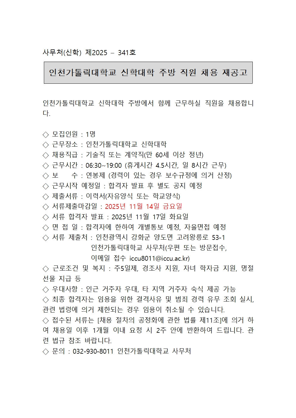 인천가톨릭대학교 신학대학 주방 직원 채용 재공고 - 숙식제공