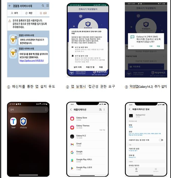 그런데 아래 사진에서 보시듯이 경찰청 사이버수사대라면서 카톡이나 문자로 링크 주소와 함께 오는 건 가짜입니다. 속으시면 절대 안 됩니다. 절대로 링크 눌러 앱 설치하시면 안 됩니다.