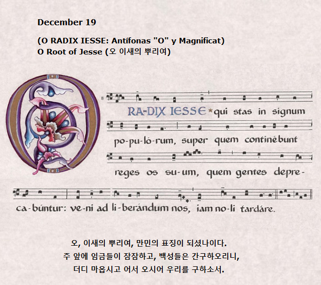 오, 이새의 뿌리여, 만민의 표징이 되셨나이다. 주 앞에 임금들이 잠잠하고, 백성들은 간구하오리니, 더디 마옵시고 어서 오시어 우리를 구하소서.