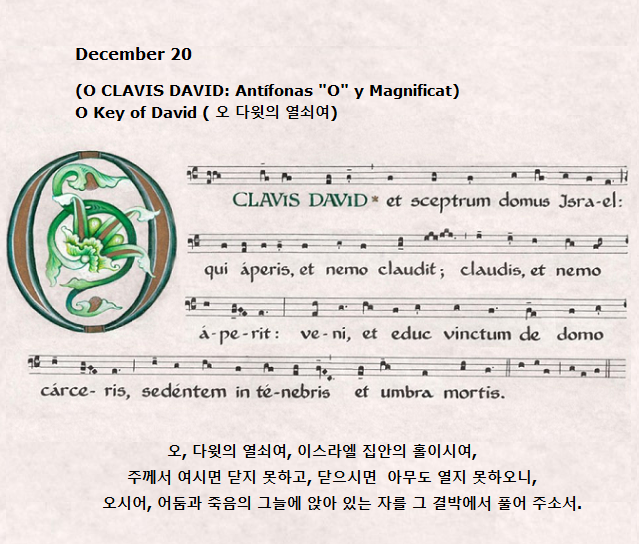 오, 다윗의 열쇠여, 이스라엘 집안의 홀이시여, 주께서 여시면 닫지 못하고, 닫으시면 아무도 열지 못하오니, 오시어, 어둠과 죽음의 그늘에 앉아 있는 자를 그 결박에서 풀어 주소서.