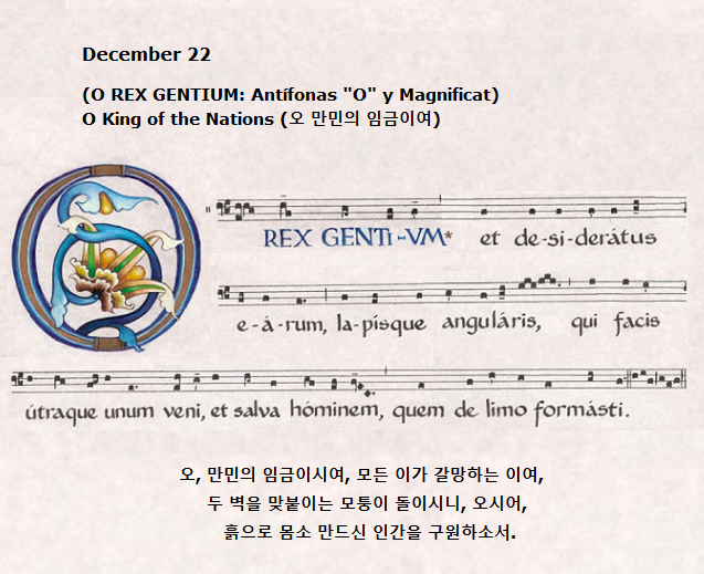 12월 17일부터 12월 23일 ‘주님의 탄생 전야 전날’까지 7일 동안 불리는 이 노래를 O-안티폰(O-Antiphon)이라고 하는데, 그 이유는 7곡 모두 감탄의 의미로 알파벳 “O” 로 시작되기 때문이다.