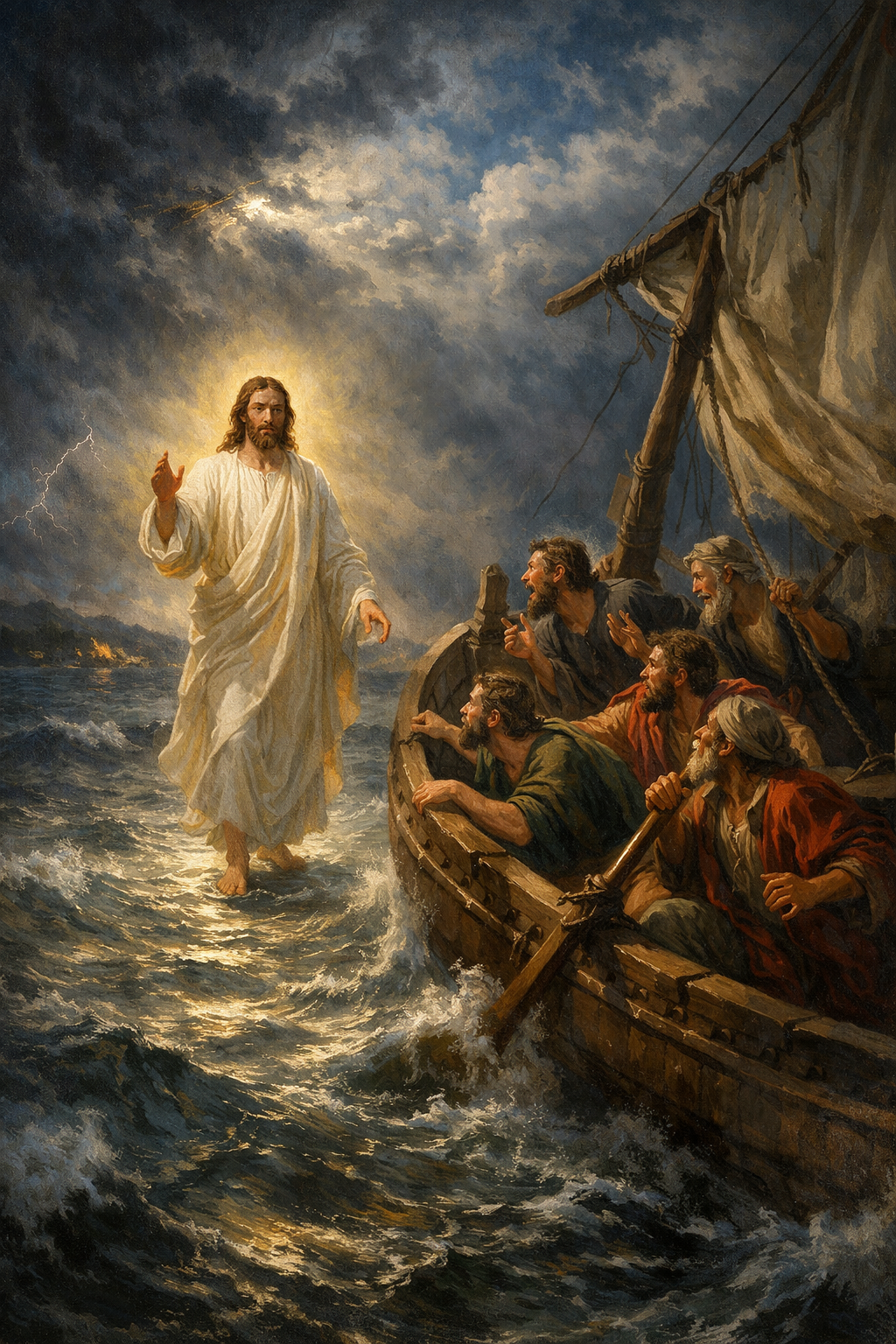 급하게 물 위를 걸어오시는 예수님을