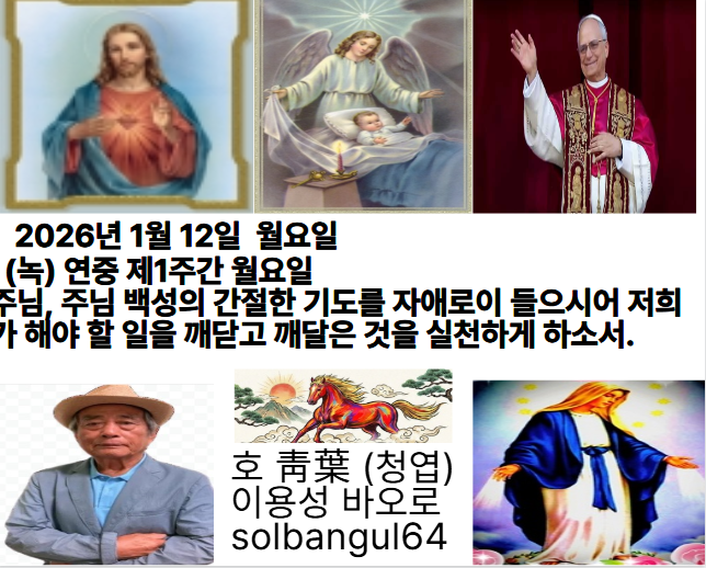 2026년 1월 12일 월요일 (녹) 연중 제1주간 월요일 나는 드높은 어좌에 앉아 계신 분을 보았네. 천사들의 무리가 그분을 흠숭하며 함께 노래하네. 보라,그분의 나라는 영원하리라.