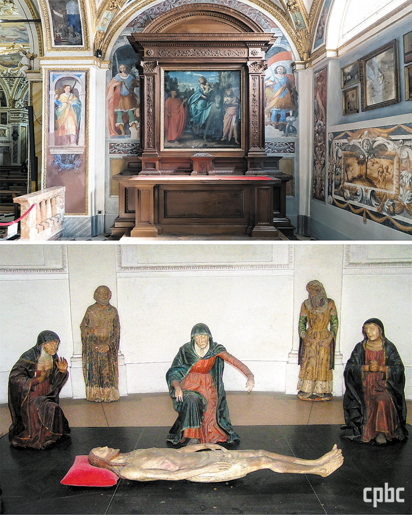 - 측면 제대 제단화와 도나티 형제가 제작한 목조 조각상군 ‘비탄’. 브람반티노의 ‘이집트로의 탈출’, 안토니오 치세리의 ‘그리스도의 매장’, 베르나르디노 디 콘티의 ‘주님 탄생 예고’ ‘성모 승천’ 제대화 등 그리스도의 수난과 성모 통고를 주제로 한 그림과 조각이 성당 곳곳에 있다.