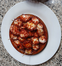 너무 힘들어 쉬고 싶었으나 그동안 일정이 빠듯했기에 매일 앞으로 나가야만 했다. 그런 우리에게 몸과 마음, 그리고 영혼도 쉼과 휴식이 필요하다고 말씀하셨다. 이미 동키로 보낸 배낭을 알베르게 엘 필라르 주인이 찾아오고 우리는 라바날 알베르게에서 이틀을 묵게 되었다. 한국 라면과 김치를 판다는 유명한 알베르게였다. 이튿날 순례자들이 떠난 조용한 마을에서 동네를 돌아보고 시간을 보냈다. 돌담 위로 떨어진 사과와 담장 옆에 피어 있는 장미도 예뻐서 사진으로 남겼다. 알베르게로 돌아와 염색하고 남편은 그동안 길렀던 수염을 정리했다. 그리고 알베르게에서 판매하는 문어 뽈보를 먹었다. 요리는 삶은 문어를 알맞게 썰어 접시에 담고 소금과 올리브유, 고춧가루를 뿌리는 것인데 크게 요리라고 할 건 없어 보인다. 그래도 이곳 사람들과 순례자들에게 인기 있는 메뉴이며 둥근 나무 접시 크기에 따라 가격이 다르다.