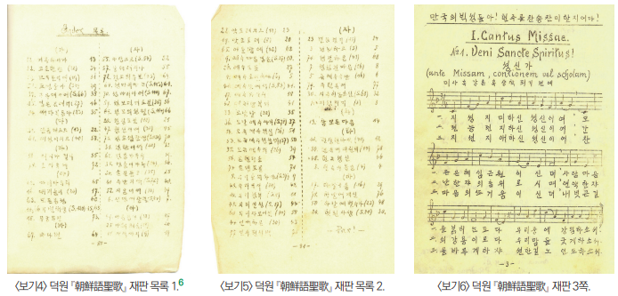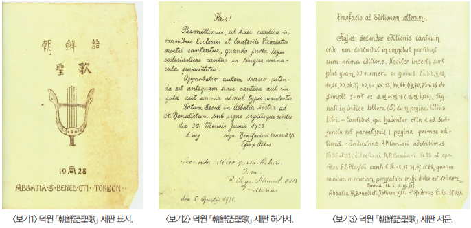 『朝鮮語聖歌』(<보기1>)가 1923년에 서울에서 처음으로 출판되었는데 지금은 분실되어 존재하지 않는다. 하지만 1928년에 덕원에서 출판된 『朝鮮語聖歌』 재판 제1쪽의 ‘인준서’(<보기2>)를 통해 초판에 대한 명확한 근거를 제시할 수 있다.