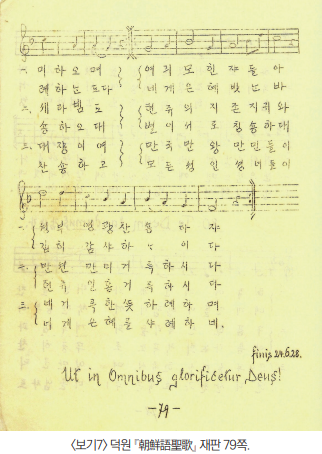 2) 서울에서 1924년 출판된 『죠션어 셩가』 초판 62곡에 1곡(무궁무진세에)을 첨가하여 1925년 재판이 출판되었다. 덕원 『朝鮮語聖歌』 재판에 ‘무궁무진세에’가 ‘In hon.B.Martyrum Coreensium’(죠선복쟈찬양가)라는 제목(76번)으로 실려있다. 따라서 여기서 『죠션어 성가』는 1925년의 재판을 의미할 것이다.