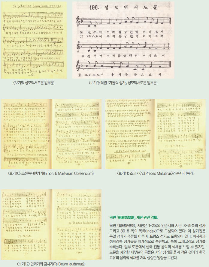 첫째로 덕원 『朝鮮語聖歌』 재판은 독일의 아욱스부르크(Augsburg) 교구 성가집인 ‘Laudate’의 편집 체계와 성가에 의존함으로써 독일 성가가 주류를 이룬다. 여기에 서울 『죠션어 셩가』에서 19곡을 첨가함으로써 프랑스 성가도 포함되었다.