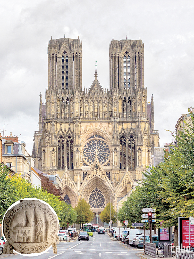 - 랭스 노트르담 대성당. 13세기 프랑스 고딕 건축의 걸작으로 프랑스 왕들의 대관식이 거행된 주교좌 성당이다. 길이 149m, 너비 30m, 내·외부 높이 최대 38m, 약 3000명을 수용할 수 있는 규모로 옛 로마네스크 성당(원 안의 모습)의 화재 후 1211년 착공되어 14세기 무렵 완성되었다. 81m 높이의 두 탑과 2300여 개의 정교한 인물상, 빛으로 가득한 내부가 특징이다.