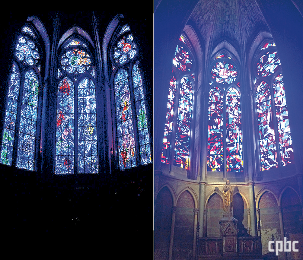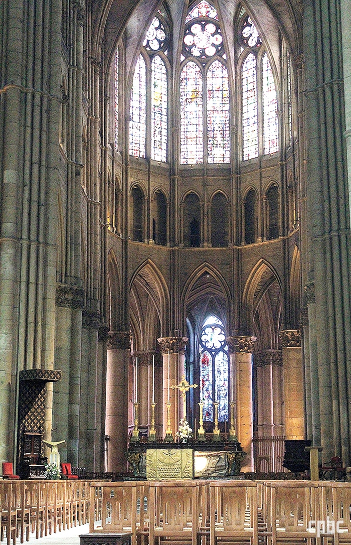 성당의 거대한 청동 문을 밀고 들어서자, 바깥의 소음이 순식간에 사라집니다. 높이 38m 천장까지 수직으로 뻗은 돌기둥을 따라 고개가 자연스럽게 위로 젖혀집니다. 그 끝에는 수백 년 동안 같은 자리를 비춰온 빛이 있습니다. 색은 시간의 방향에 따라 변합니다. 아침의 빛은 20세기에 복원한 동쪽 후진의 스테인드글라스 창을 통과해 주 제단을 비추고, 오후의 빛은 13세기의 서쪽의 큰 장미창으로 돌아와 다채로운 색으로 넓은 공간을 가득 채웁니다. 특히 마르크 샤갈의 청색과 자색이 어우러진 현대식 스테인드글라스가 인상적인데요, 빛이 성당의 회색 돌벽에 닿을 때면 공간 전체가 한순간 푸른 숨결로 물드는 듯합니다.
