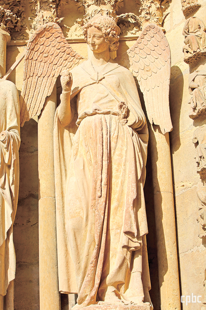 - 서쪽 정면의 미소 짓는 천사 조각상(1240~1250년경). 1차 세계대전 중 포격으로 파손되었다가 복원되었다. 머리 원형은 팔레 뒤 타우에 소장되어 있다. 천사의 미소는 전쟁의 상처를 넘어선 신앙과 희망의 표징으로 남아 있다.