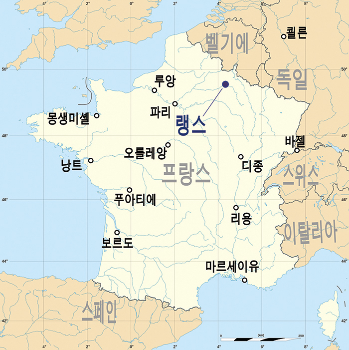 랭스는 샴페인의 본고장인 프랑스 북동부의 샹파뉴 평원 중앙에 자리하고 있습니다. 세계적인 샴페인 회사의 지하 저장고 ‘크라예르(Crayères)’는 도시의 명소로 시음 프로그램으로도 유명하지요. 이곳이 세계적 샴페인 생산지가 된 건 도시를 굽이쳐 흐르는 벨강 덕분입니다. 물길은 교통과 상업의 기반을 제공했고, 강 주변 비옥한 충적토는 포도 재배에 적합한 토양을 마련해주었습니다.