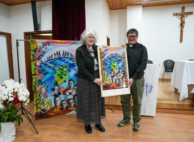 - 11월 28일 서울시 동소문동 성골롬반외방선교회 선교센터에서 한국지부장 권세오 신부(오른쪽)와 재클린 씨가 태피스트리 작품 <기억으로 짜인> 전달식 후 기념사진을 찍고 있다. 성골롬반외방선교회 제공