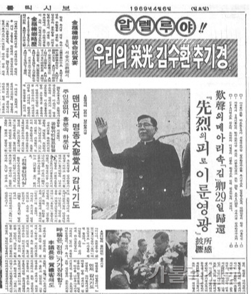 당시 김 추기경은 일본에서 발표 소식을 들었고, 이튿날인 29일 김포공항을 통해 귀국했습니다. 가톨릭시보는 4월 6일자 3면에서 ‘알렐루야!! 우리의 영광 김수환 추기경’이라는 제목의 머리기사에서 추기경 탄생에 환호하는 한국교회의 분위기를 생생하게 전했습니다.