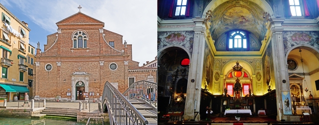 이 성당은 6세기 말이나 8세기 중엽에 건립되었다는 기록이 있으나 현재의 건물은 산소비노가 전체 구조를 90도 회전시켜서 그릭 크로스의 중앙집중형으로 설계한 르네상스 양식의 성당입니다. 성당 내부에서 파사드로 나가는 출입구 상부에 파이프 오르간이 있고, 그 아래에 제롤라모 다 산타크로체(Gerolamo da Santacroce)의 <최후의 만찬>(1549년) 성화가 있습니다.