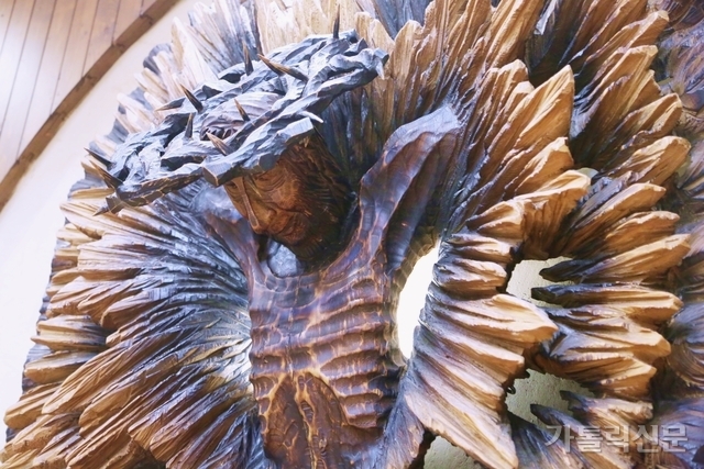 - 제단 위에서 무릎을 꿇어야만 볼 수 있는 성전 제대의 십자가는 ‘다 이루신’ 예수님의 얼굴이 은은한 미소를 짓고 계신 듯하다. 박효주 기자
