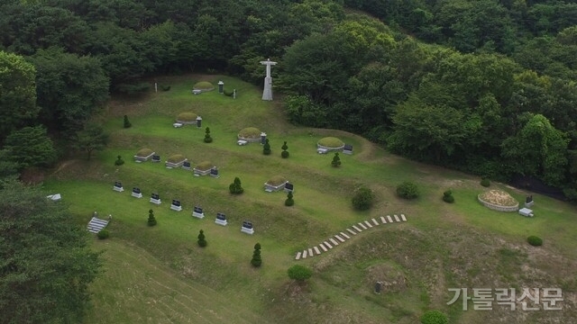 - 복자 윤유오의 진묘를 중심으로, 어농성지에서 현양하는 복자 16위의 의묘가 함께 조성된 순교자 묘역. 이승환 기자