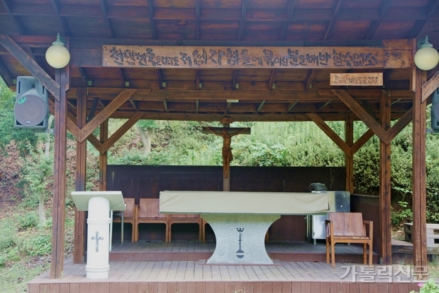 - “천만 번 죽을지라도 저 십자 형틀에 묶이신 분을 배반할 수 없소”라는 복자 윤유일의 말을 현판으로 건 어농성지 야외 제대. 박효주 기자