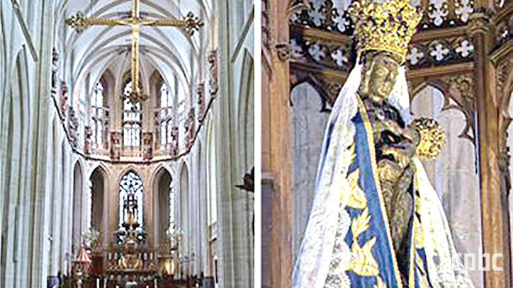 성당 곳곳에 성모님의 상징인 ‘신비스러운 장미’가 보이지만, 주역은 주 제대의 ‘할레의 검은 마돈나’입니다. 아기 예수에게 젖을 먹이는 성모님 모습인데요. 둘 다 왕관을 쓰고 있지만 모자간 친밀한 유대감이 물씬 드러납니다. 성모자상은 부분적으로 은으로 덮인 흔적이 보입니다. 그런데 왜 검게 됐을까?