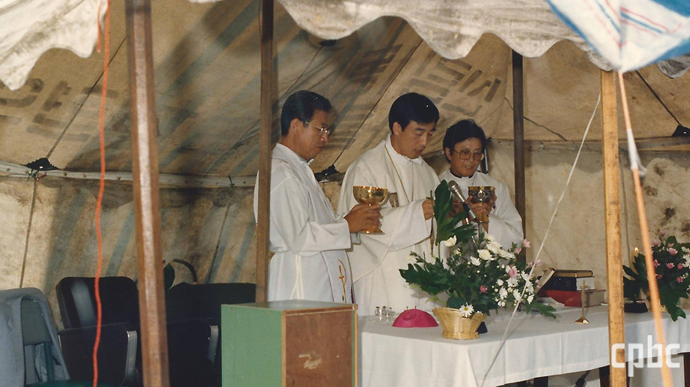 - 1987년 8월 29일 신림사거리 관악종합시장 옥상에서 서울가톨릭사회복지회를 담당하는 강우일 주교가 요셉의원 개원 미사를 주례하고 있다.