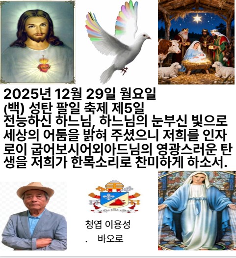 2025년 12월 29일 월요일 (백) 성탄 팔일 축제 제5일 하느님은 세상을 너무나 사랑하신 나머지 외아들을 내주시어, 그를 믿는 사람은 누구나 멸망하지 않고 영원한 생명을 얻게 하셨네.