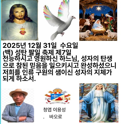 2025년 12월 31일 수요일 (백) 성탄 팔일 축제 제7일 우리에게 한 아기가 태어났고, 우리에게 한 아들이 주어졌네. 왕권이 그의 어깨에 놓이고, 그의 이름은 놀라운 경륜가라 불리리라.