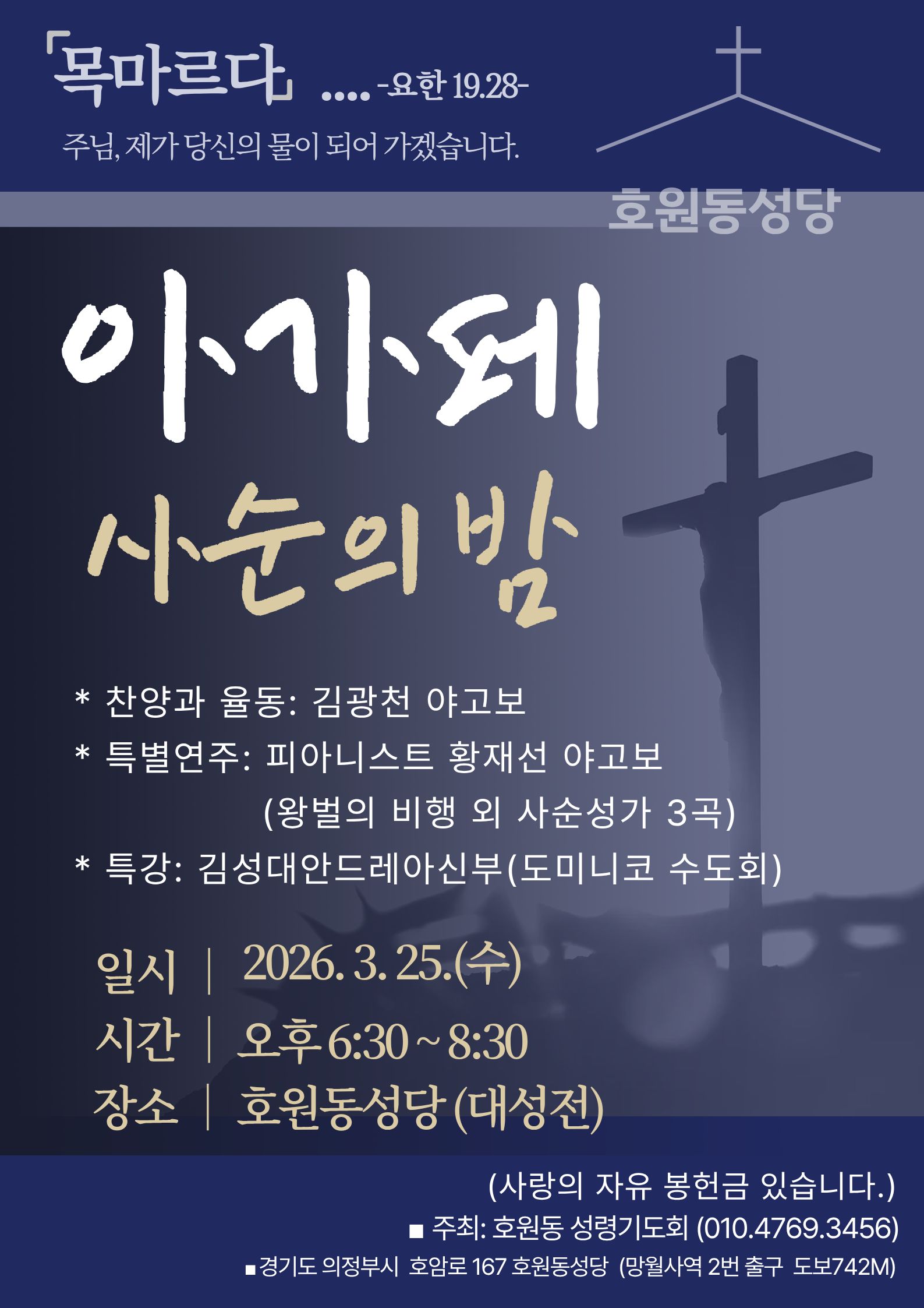 [목마르다].... -요한 19.28- 아가페 사순의 밤 사순을 보내며 찬양과 말씀으로 주님 마음에 한걸음 더 다가설 수 있는 시간을 준비했습니다. 오셔서 주님을 충만히 느끼는 은혜로운 시간 되세요.