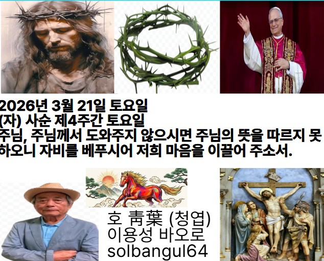 2026년 3월 21일 토요일 (자) 사순 제4주간 토요일 죽음의 오랏줄이 나를 두르고, 저승의 올가미가 나를 휘감았네. 곤경 중에 나 주님을 불렀더니, 당신 성전에서 내 목소리 들으셨네.