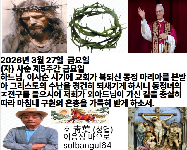 2026년 3월 27일 금요일 (자) 사순 제5주간 금요일 주님, 자비를 베푸소서. 제가 짓눌리나이다. 원수와 박해자들 손에서 구원하소서. 주님, 제가 당신을 불렀으니, 부끄럽지 않게 하소서.