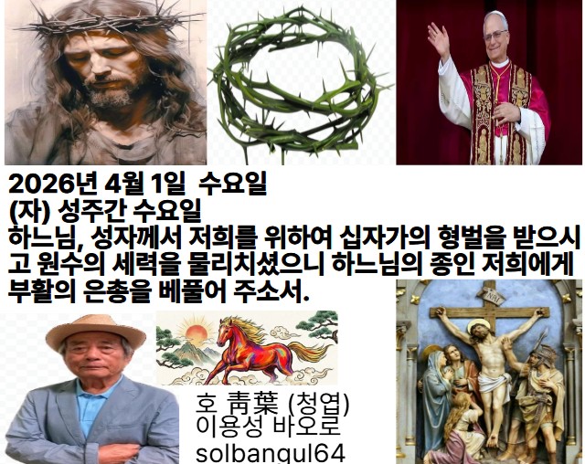 2026년 4월 1일 수요일 (자) 성주간 수요일 주님은 죽음에 이르기까지, 십자가 죽음에 이르기까지 순종하셨으니, 예수님의 이름 앞에 하늘과 땅 위와 땅 아래에 있는 자들이 다 무릎을 꿇고, 예수 그리스도는 주님이시라고 모두 고백하며, 하느님 아버지께 영광을 드리네.