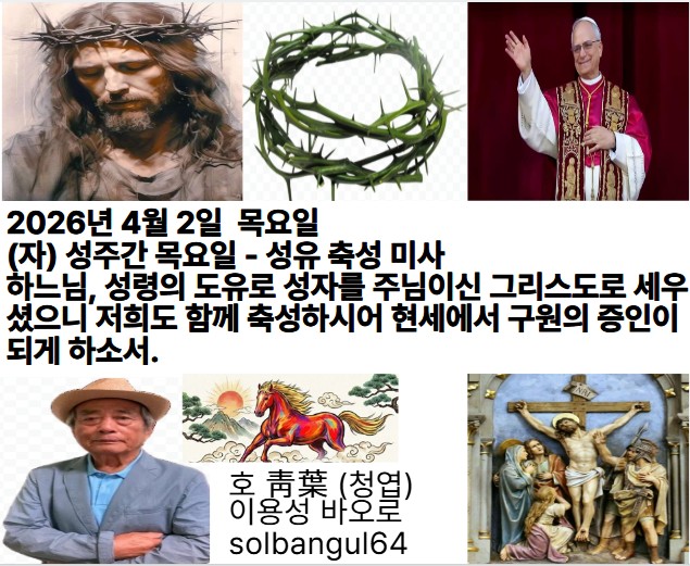2026년 4월 2일 목요일 (자)성주간 목요일 - 성유 축성 미사 예수 그리스도는 우리가 한 나라를 이루어 당신의 아버지 하느님을 섬기는 사제가 되게 하셨으니, 영광과 권능을 영원무궁토록 받으소서. 아멘.