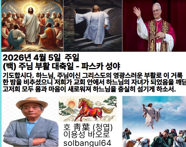 2026년 4월 5일 일요일 (백) 주님 부활 대축일 - 파스카 성야 파스카 성야의 모든 예식은 주님께서 부활하신 거룩한 밤을 기념하여 교회 전례에서 가장 성대하게 거행한다. 하느님께서 이스라엘 백성을 이집트의 종살이에서 해방시켜 주셨듯이, 예수 그리스도를 통하여 인류를 죄의 종살이에서 해방시켜 주신 날을 기념한다. 따라서 교회는 장엄한 전례로, 죽음을 이기시고 참된 승리와 해방을 이루신 예수 그리스도의 부활을 맞이한다.