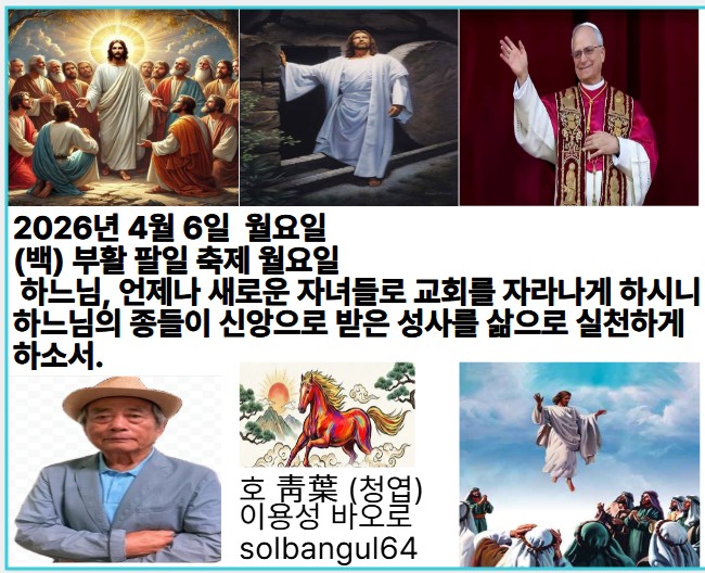 2026년 4월 6일 월요일 (백) 부활 팔일 축제 월요일 주님이 젖과 꿀이 흐르는 땅으로 너희를 데려오셨으니, 주님의 가르침을 언제나 되뇌어라. 알렐루야.