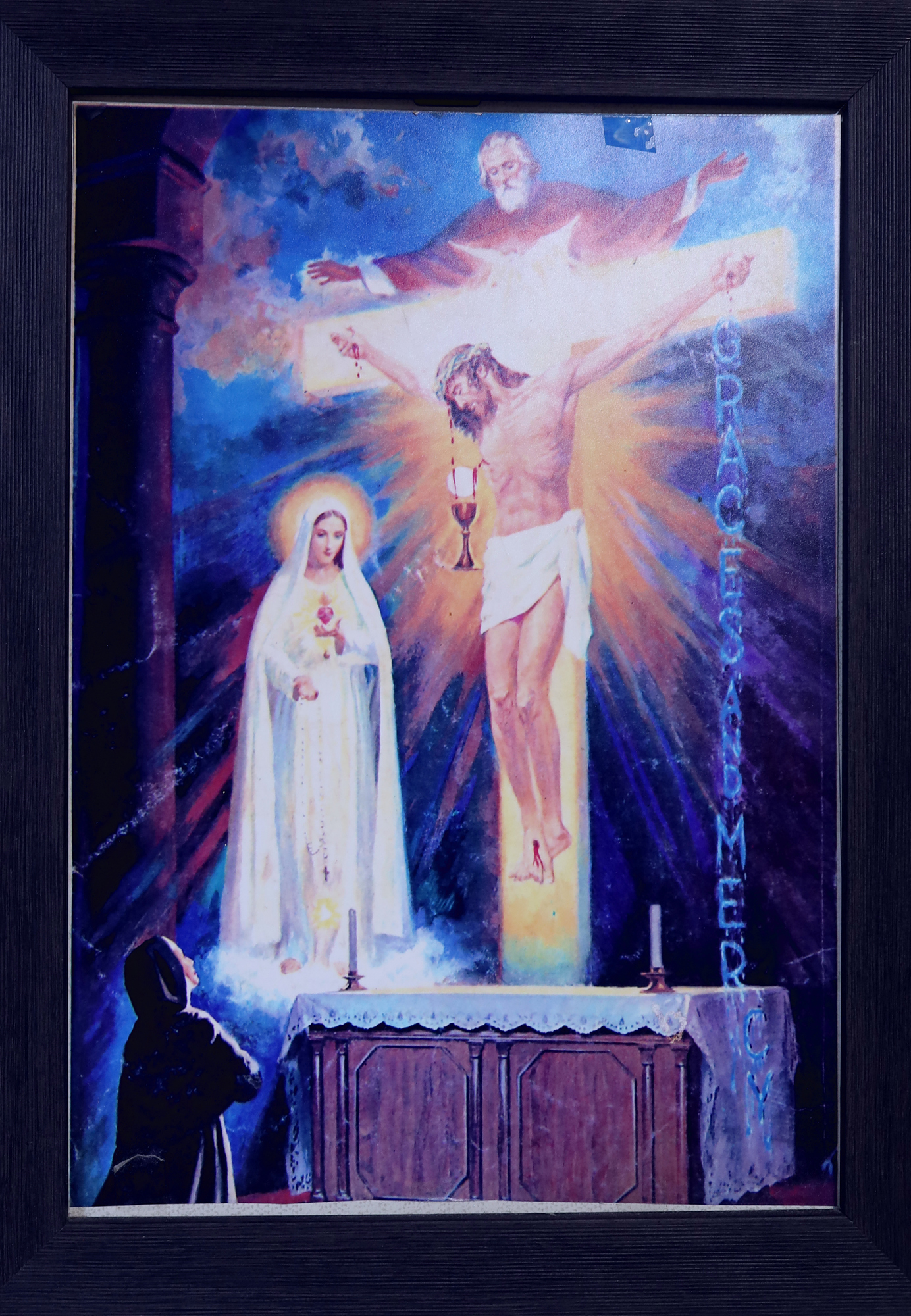 그런데 겉옷은 벗으시고 통자 속옷은 그냥 입고 있으려는데 로마 군인이 속옷마저 벗으라고 말합니다 완전히 발가벗긴채 나체로 십자가에 매달리는게 거시기한 예수님께서는 로마 병정에게 속옷은 입은채로 해달라고 애원하십니다 병정은 그말을 무시하고 벗으라고 강요합니다 그광경을 보고있던 성모님께서는 당신께서 쓰고계시는 베일을 벗으셔서 십자가형을 집행하던 로마 백부장에게 건넵니다 성난 군중에게서 예수님을 보호하는 친절을 베풀었던 백부장은 받은 베일을 속옷을 벗으려던 예수님에게 줍니다 예수님께서는 통자속옷을 다벗고 난후 베일을 서혜부에 두르십니다 즉 예수님께서는 어머니의 눈물이 베어있는 베일을 두루시고 계신 것입니다. 잔인하고 슬픈 장면.