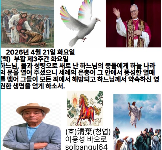 2026년 4월 21일 화요일 (백) 부활 제3주간 화요일) 낮은 이든 높은 이든 하느님을 경외하는 모든 이들아, 우리 하느님을 찬미하여라. 그리스도의 권세와 권능과 구원이 나타났다. 알렐루야.