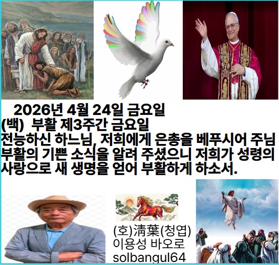 2026년 4월 24일 금요일 (백) 부활 제3주간 금요일) 죽임을 당하신 어린양은 권능과 신성과 지혜와 힘과 영예를 받으소서. 알렐루야.