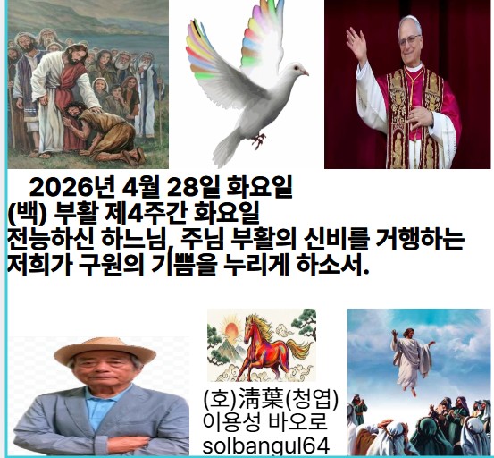 2026년 4월 28일 화요일 (백) 부활 제4주간 화요일 기뻐하고 즐거워하며 하느님께 영광 드리세. 주 우리 하느님, 전능하신 분이 다스리신다. 알렐루야.