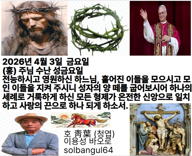 2026년 4월 3일 금요일 (홍) 주님 수난 성금요일 그리스도님, 찬미와 영광 받으소서.그리스도는 우리를 위하여 죽음에 이르기까지, 십자가 죽음에 이르기까지 순종하셨네. 하느님은 그분을 드높이 올리시고 모든 이름 위에 뛰어난 이름을 주셨네. 그리스도님, 찬미와 영광 받으소서.