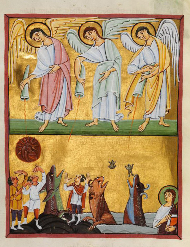 - 1010년경 독일 라이헤나우수도원에서 제작된 필사본 「밤베르크 묵시록」 삽화 중 <네 번째부터 여섯 번째 대접>. 위키미디어