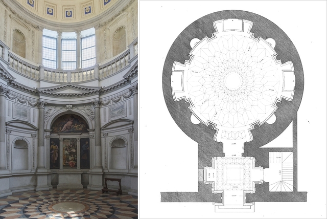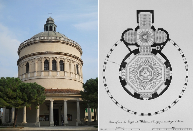 - (왼쪽부터) 마돈나 디 캄파냐 성당 외관과 평면도. 마돈나 디 캄파냐 성당의 외관은 원형이지만 내부는 팔각형으로 구성됐다. 출처 위키미디어