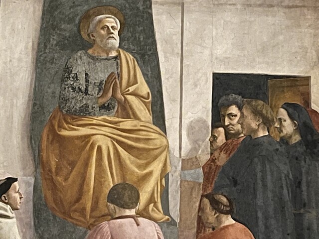 그리고 산토 스피리토 성당에서 서쪽으로 조금 걸어가면 산타 마리아 델 카르미네 성당(Basilica di Santa Maria del Carmine)이 있습니다. 그 성당의 브란카치 경당(Cappella Brancacci)에는 르네상스 회화의 시작을 알리는 마사초의 <아담과 하와의 추방(Cacciata di Adamo e Eva)>과 <사도좌에 앉은 베드로(San Pietro in cattedra)>를 볼 수 있는데, 후자에서 마사초와 알베르티 그리고 브루넬레스키의 모습을 볼 수 있습니다.