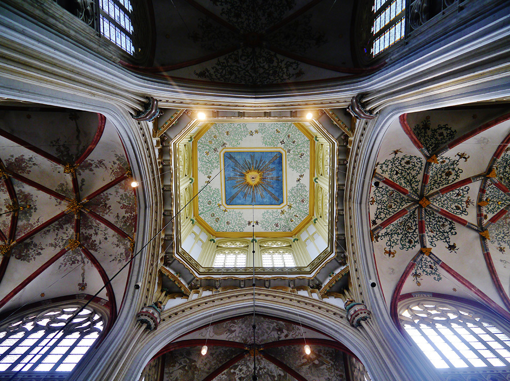 - 성 요한 대성당의 본랑. 십자형 바실리카 평면 구조로 14~16세기 브라반트 고딕으로 확장되어 1530년경 완성됐다. 천장에 붉게 채색한 늑골이 교차하는 리브 볼트가 보이며, 볼트면에는 덩굴·꽃 문양이 남아 있다.