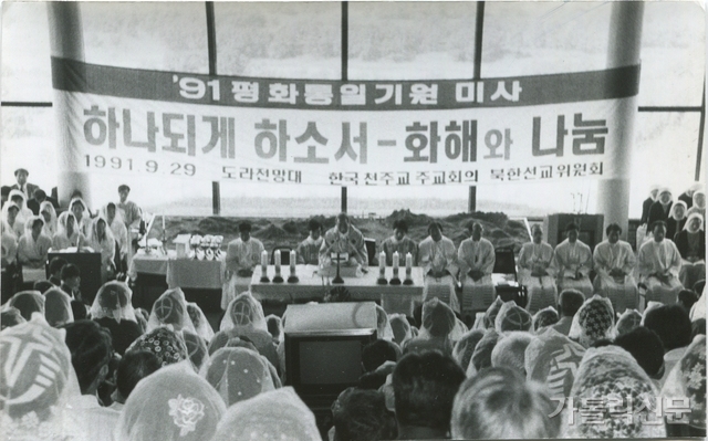 - 주교회의 북한선교후원회가 1991년 9월 29일 도라전망대에서 ‘평화통일 기원미사’를 봉헌하고 있다. 가톨릭신문 자료사진