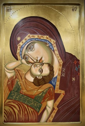 <이콘 설명> <감미로운 동정녀> 정태현 신부 - 모자의 얼굴이 맞닿아 있고 아기 예수는 어머니의 뺨을 어루만지고 있다. 이 이콘은 모자간의 사랑의 감정과 손길을 강조한다. 예수님의 인성을 부각시킨 이 이콘에서도 성모님은 하느님의 어머니(ΜΡ ΘΥ)라 칭해진다.