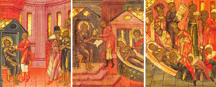 - (좌로부터) 남은 음식을 전해 받는 성 알렉시오, 하느님의 분부로 자서전을 기록하는 성 알렉시오, 성 알렉시오의 죽음