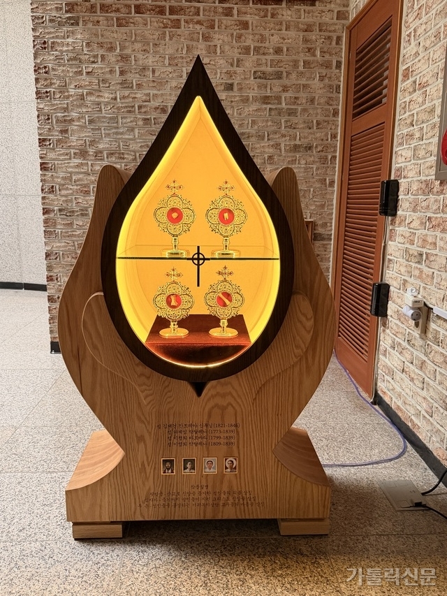 - 서귀복자성당 제대에 모셔진 김대건 성인을 비롯한 허계임 막달레나, 이정희 바르바라, 이영희 막달레나 네 명의 한국 성인 유해. 이주연 기자
