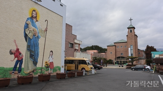 - 입구에 10m 대형 성화벽화가 돋보이는 서귀복자성당 전경. 이주연 기자